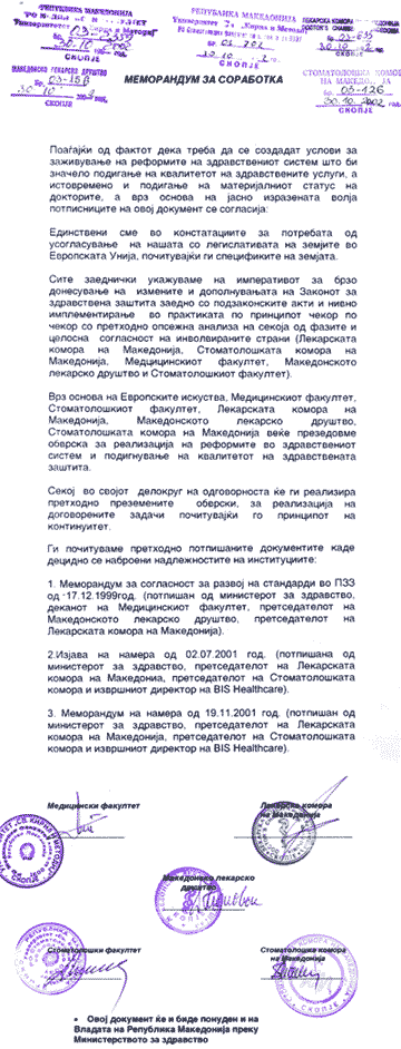 Во просториите на Лекарската комора на Македонија од името на институциите што ги претставуваат Меморандумот за соработка го потпишаа проф. д-р Јордан Савески, проф. д-р Алексеј Дума, проф. д-р Анте Поповски, проф. д-р Марија Накова и проф. д-р Миле Царчев.
