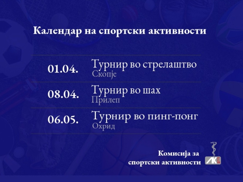 Комисијата за спортски активности упатува покана до сите членови на Лекарската комора да се вклучат во спортските активности, секој согласно своите интереси. За повеќе информации околу организацијата на турнирите како и пријавување за учество може да се направи и кај претседателот на оваа комисија, д-р Љупчо Милановски на тел. број 070 210 530.