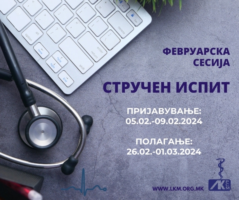 Од денес, 05.02.2024 година, почнува пријавувањето за полагање на стручен испит во февруарската испитна сесија. Пријавувањето ќе трае до 09.02.2024 година, а полагањето на испитот ќе биде од 26.02.2024 година до 01.03.2024 година.